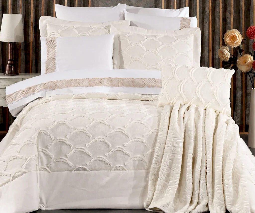 Set içerisinde yer alan yatak örtüsü, nevresim takımı ve yumuşacık battaniye, birbirleriyle tam uyumlu renk ve desenlerden oluşur. 6 adet yastık kılıfı (dantelli, desenli ve pano) ile yatağınızda katmanlı ve lüks bir otel konforu oluşturabilirsiniz.