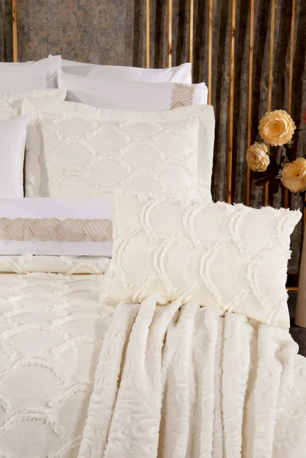 Yatak odanızın tüm ihtiyacını tek bir sette buluşturan Viorra Collection 10 Parça Çeyiz Seti, pamuklu kumaşın sağlıklı dokusunu dantel zarafetiyle birleştiriyor. Yatak örtüsünden battaniyeye, nevresimden dekoratif yastıklara kadar eksiksiz bir kombin sunan bu set, çeyizinizin en görkemli parçası olacak.