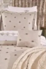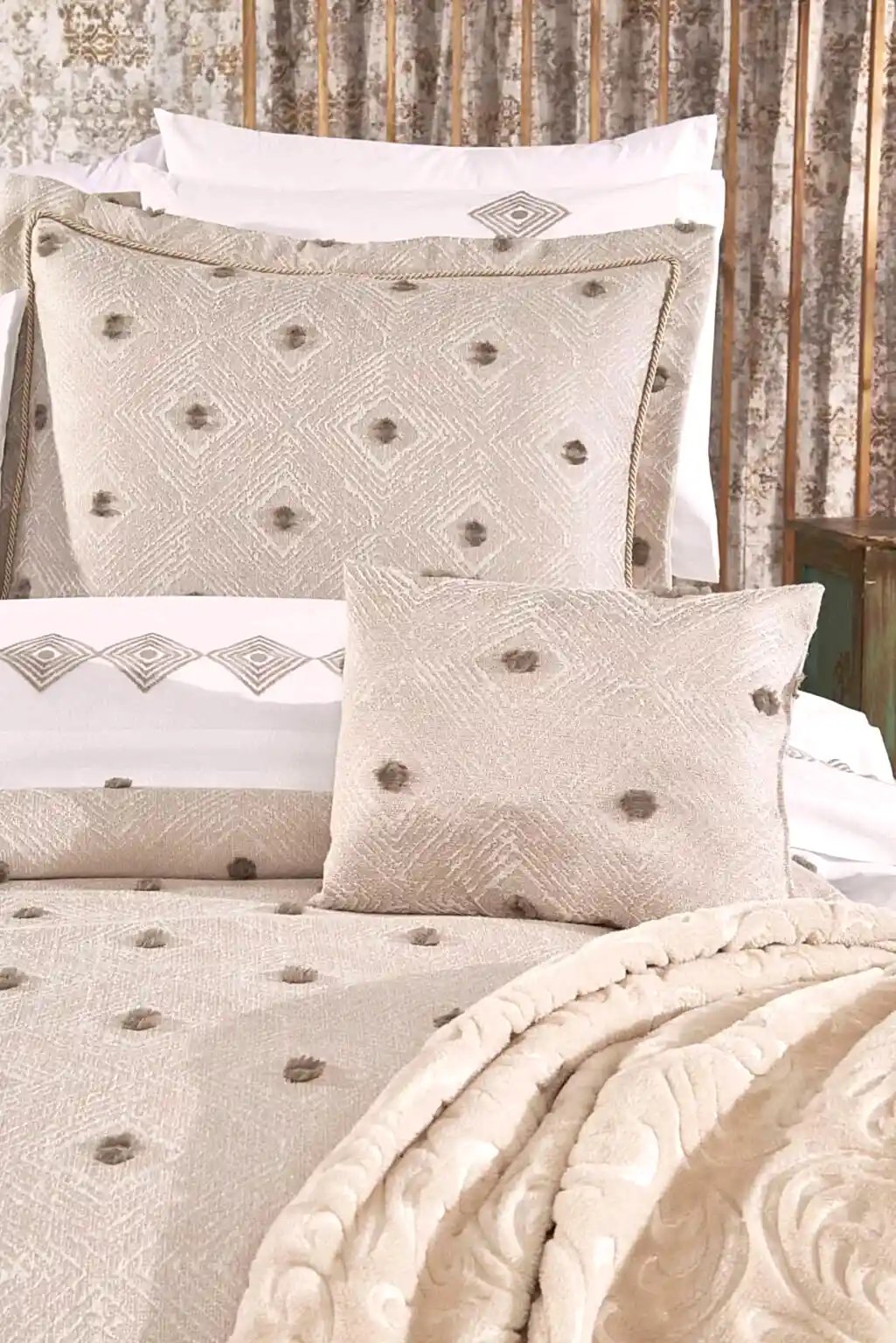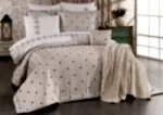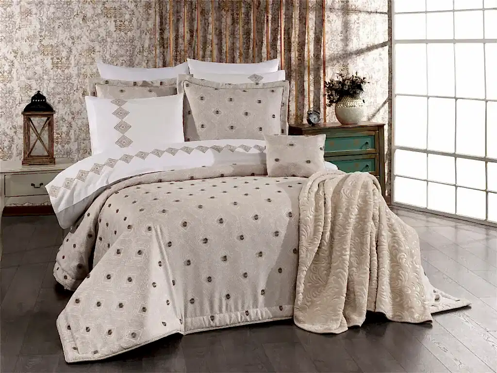 Set içerisinde yer alan yatak örtüsü, nevresim takımı ve yumuşacık battaniye, birbirleriyle tam uyumlu renk ve desenlerden oluşur. 6 adet yastık kılıfı (dantelli, desenli ve pano) ile yatağınızda katmanlı ve lüks bir otel konforu oluşturabilirsiniz.