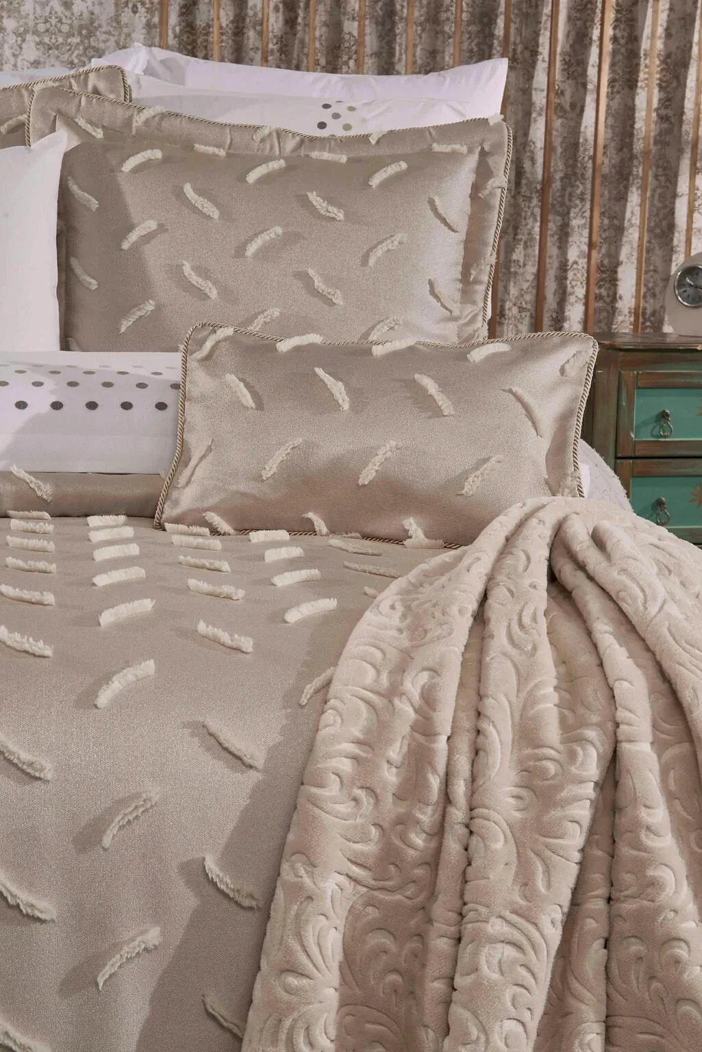 Set içerisinde yer alan yatak örtüsü, nevresim takımı ve yumuşacık battaniye, birbirleriyle tam uyumlu renk ve desenlerden oluşur. 6 adet yastık kılıfı (dantelli, desenli ve pano) ile yatağınızda katmanlı ve lüks bir otel konforu oluşturabilirsiniz.