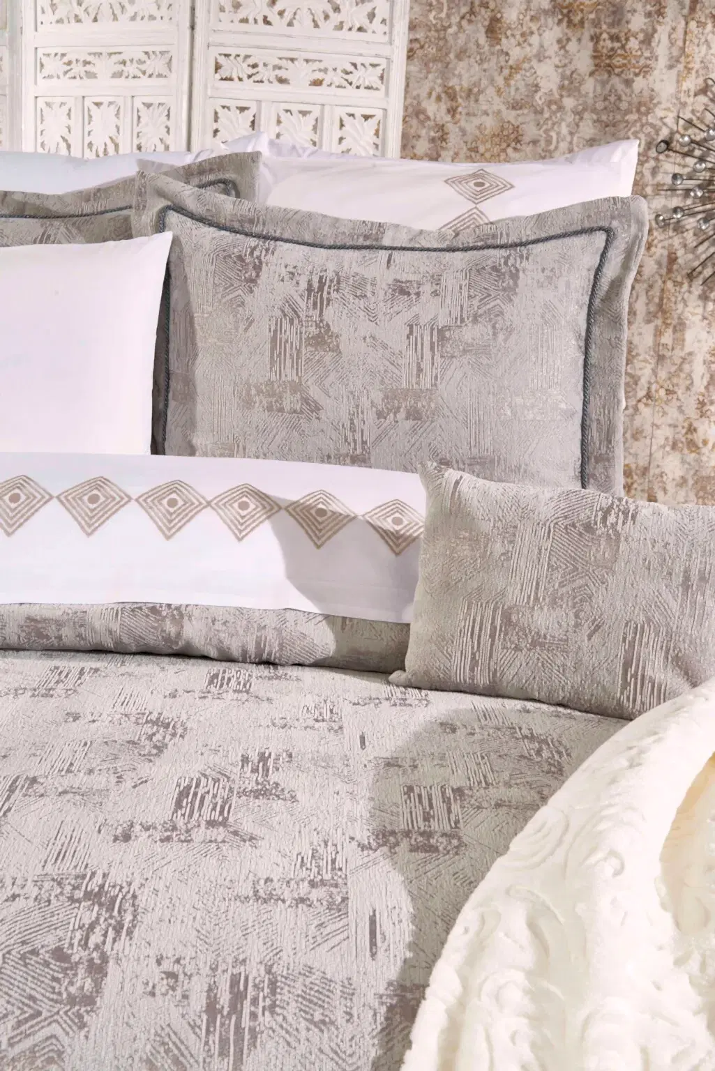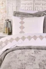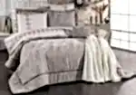 Set içerisinde yer alan yatak örtüsü, nevresim takımı ve yumuşacık battaniye, birbirleriyle tam uyumlu renk ve desenlerden oluşur. 6 adet yastık kılıfı (dantelli, desenli ve pano) ile yatağınızda katmanlı ve lüks bir otel konforu oluşturabilirsiniz.