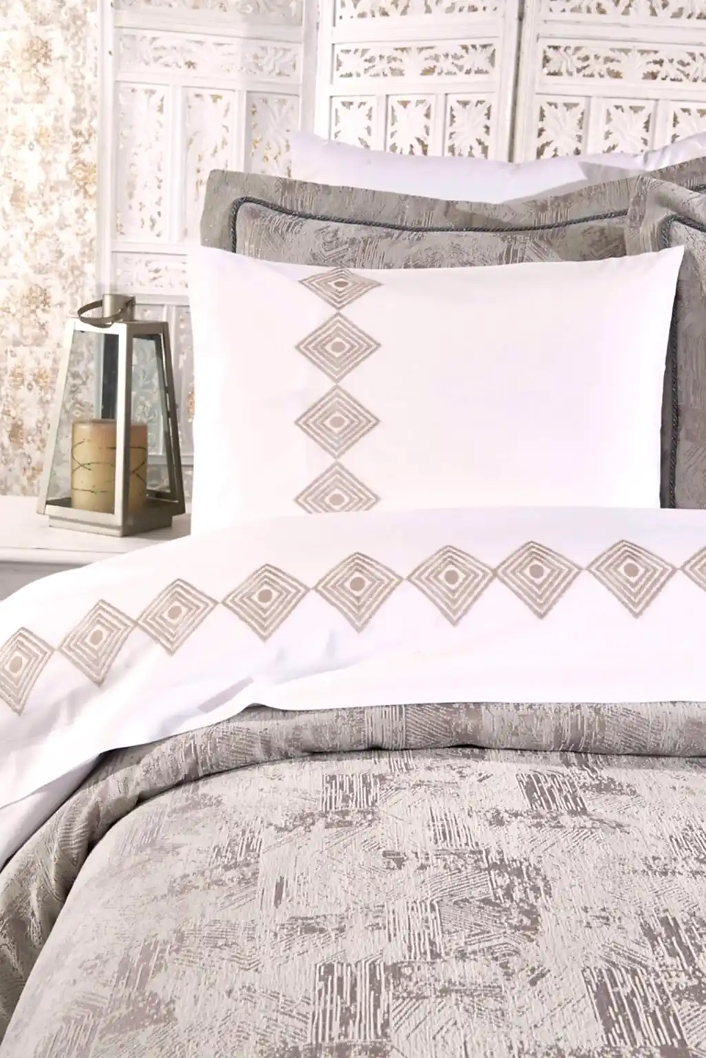 Tasarım: Zarif dantel işlemeleri ve özel pano baskılı yastıklarla zenginleştirilmiştir.