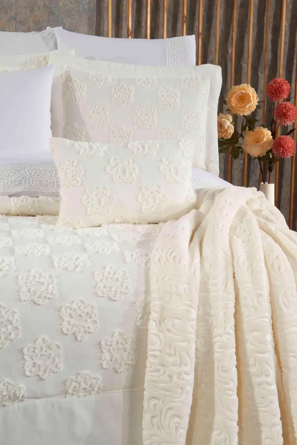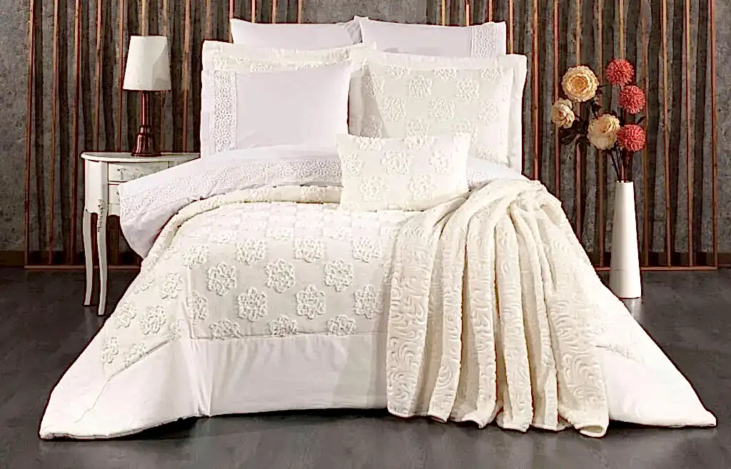 Yatak odanızın tüm ihtiyacını tek bir sette buluşturan Viorra Collection 10 Parça Çeyiz Seti, pamuklu kumaşın sağlıklı dokusunu dantel zarafetiyle birleştiriyor. Yatak örtüsünden battaniyeye, nevresimden dekoratif yastıklara kadar eksiksiz bir kombin sunan bu set, çeyizinizin en görkemli parçası olacak.