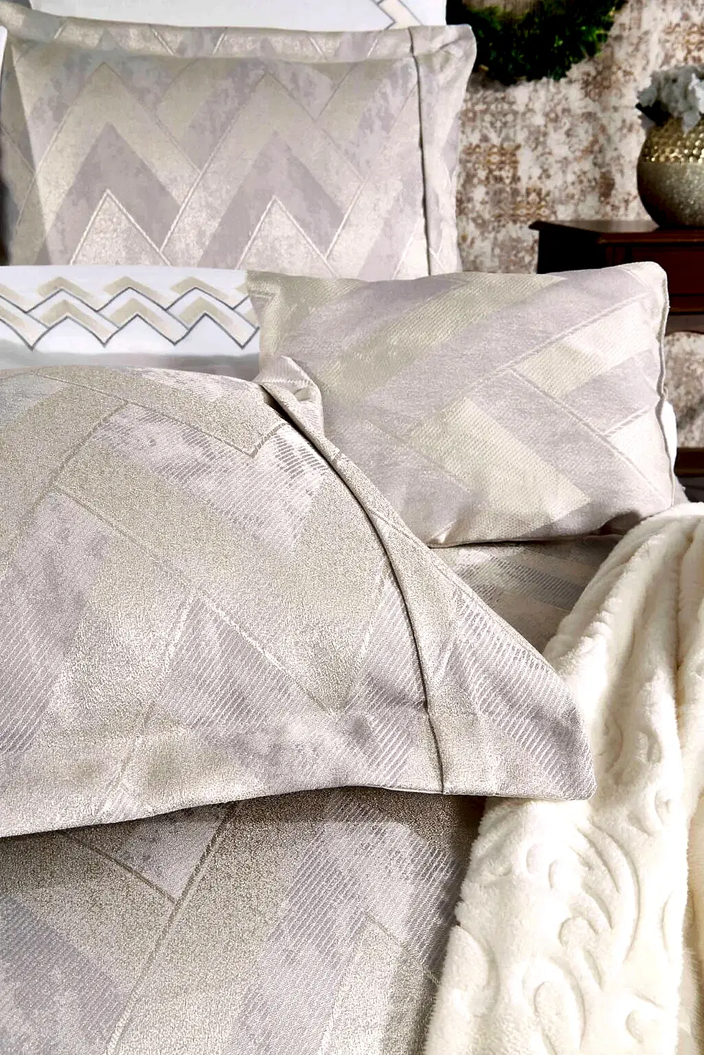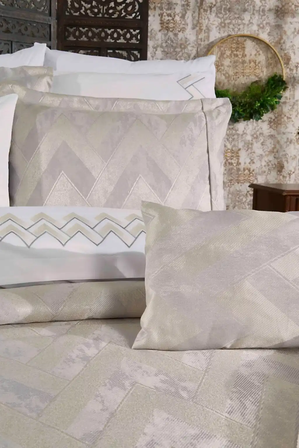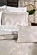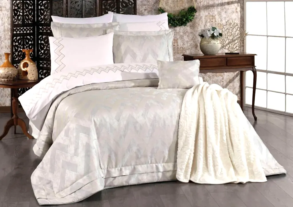 Set içerisinde yer alan yatak örtüsü, nevresim takımı ve yumuşacık battaniye, birbirleriyle tam uyumlu renk ve desenlerden oluşur. 6 adet yastık kılıfı (dantelli, desenli ve pano) ile yatağınızda katmanlı ve lüks bir otel konforu oluşturabilirsiniz.