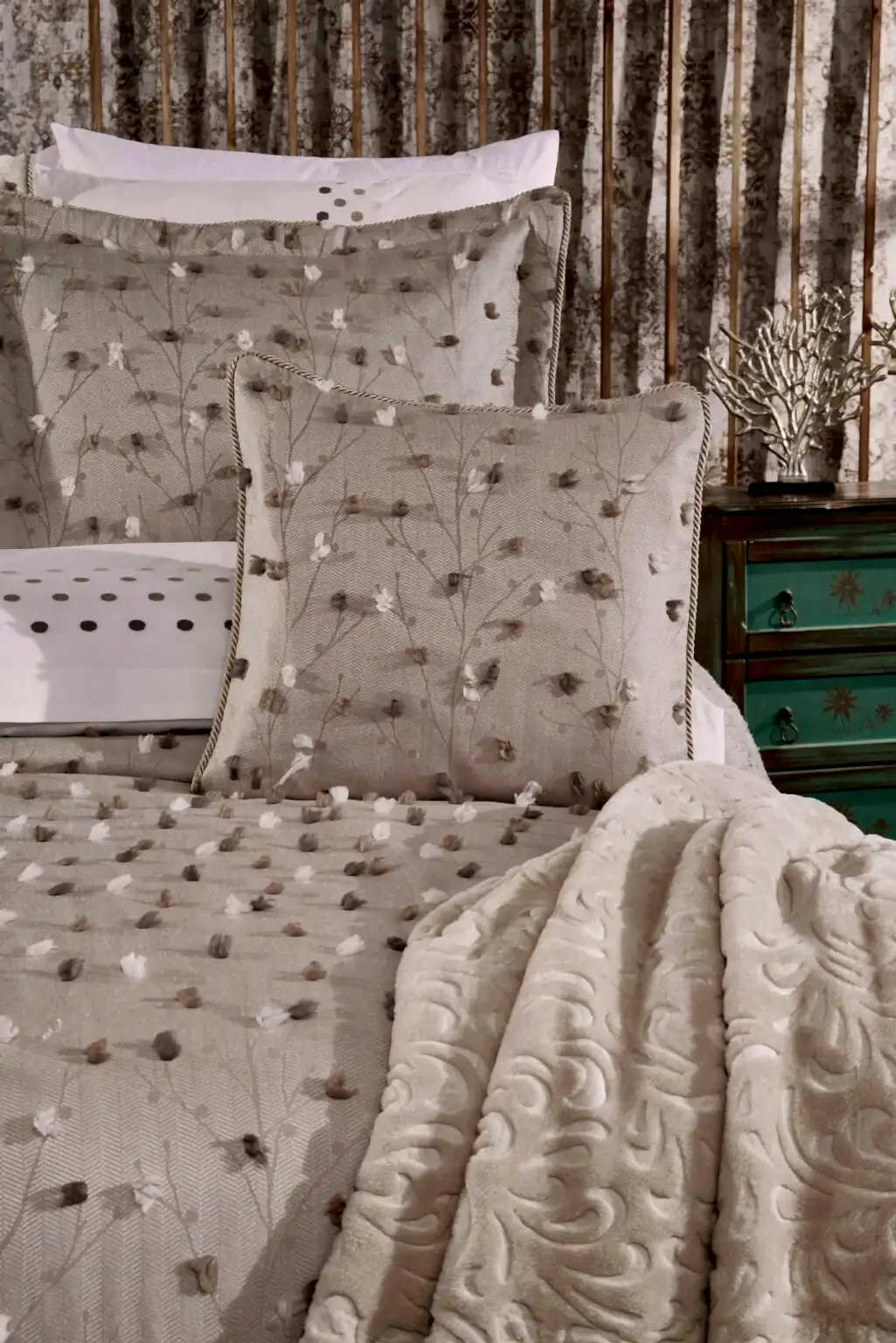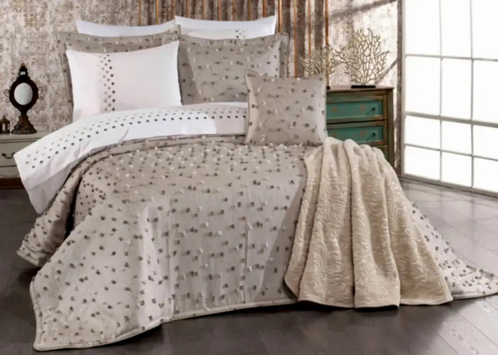 Set içerisinde yer alan yatak örtüsü, nevresim takımı ve yumuşacık battaniye, birbirleriyle tam uyumlu renk ve desenlerden oluşur. 6 adet yastık kılıfı (dantelli, desenli ve pano) ile yatağınızda katmanlı ve lüks bir otel konforu oluşturabilirsiniz.