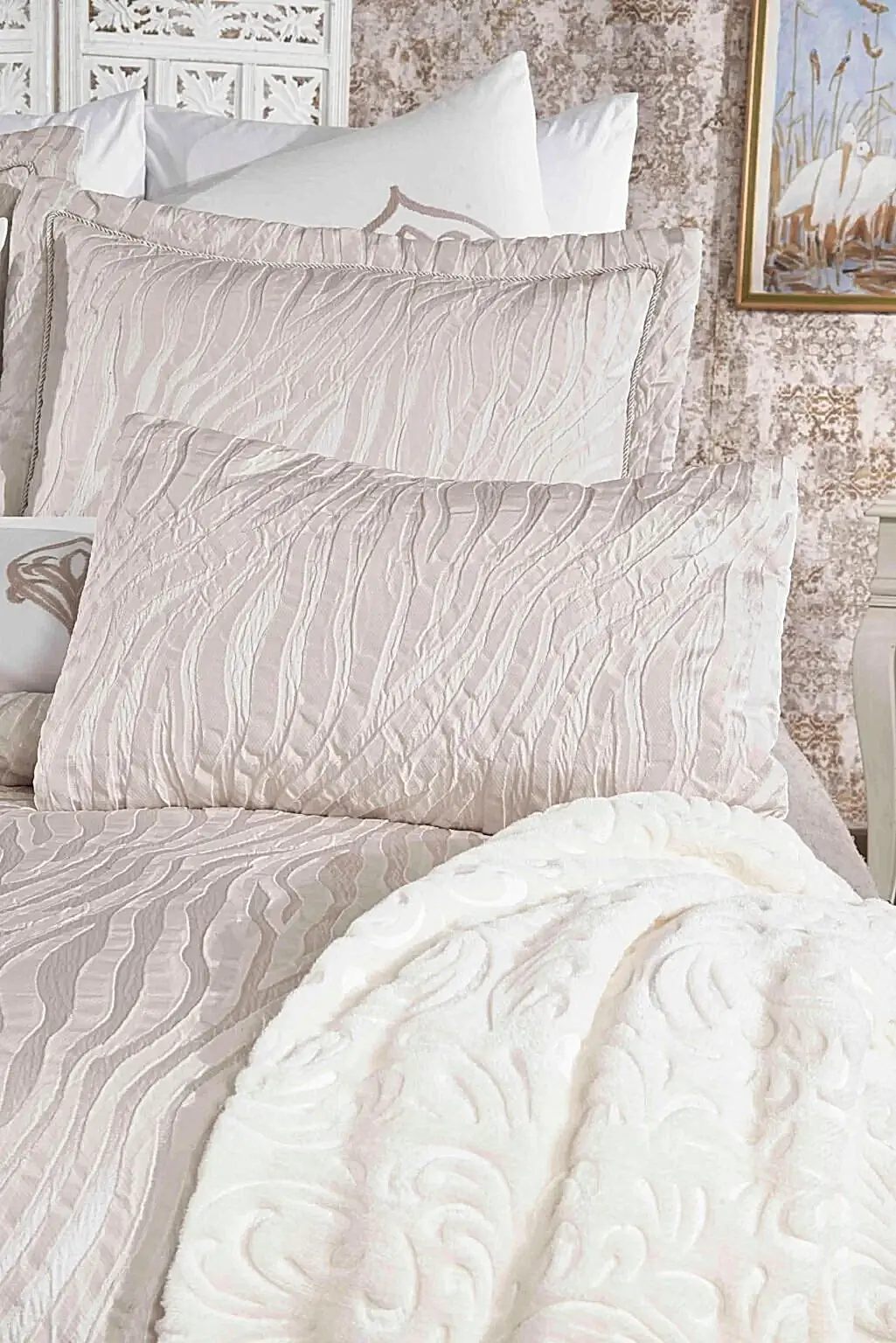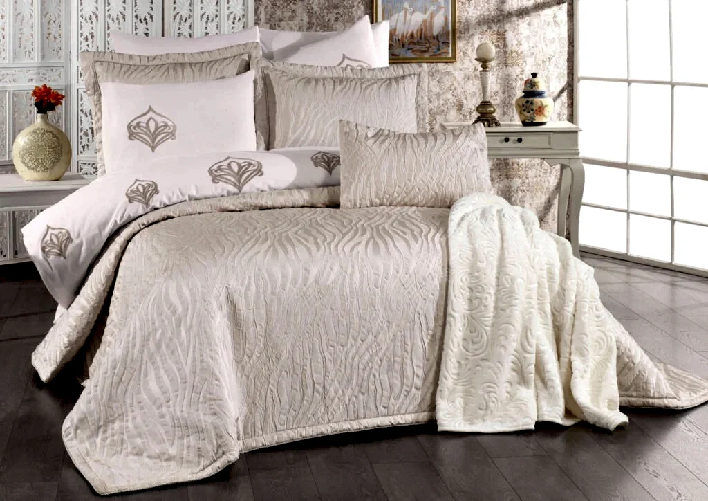 Set içerisinde yer alan yatak örtüsü, nevresim takımı ve yumuşacık battaniye, birbirleriyle tam uyumlu renk ve desenlerden oluşur. 6 adet yastık kılıfı (dantelli, desenli ve pano) ile yatağınızda katmanlı ve lüks bir otel konforu oluşturabilirsiniz.