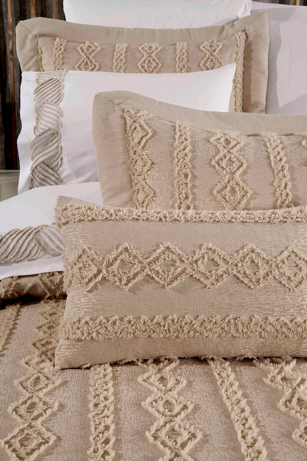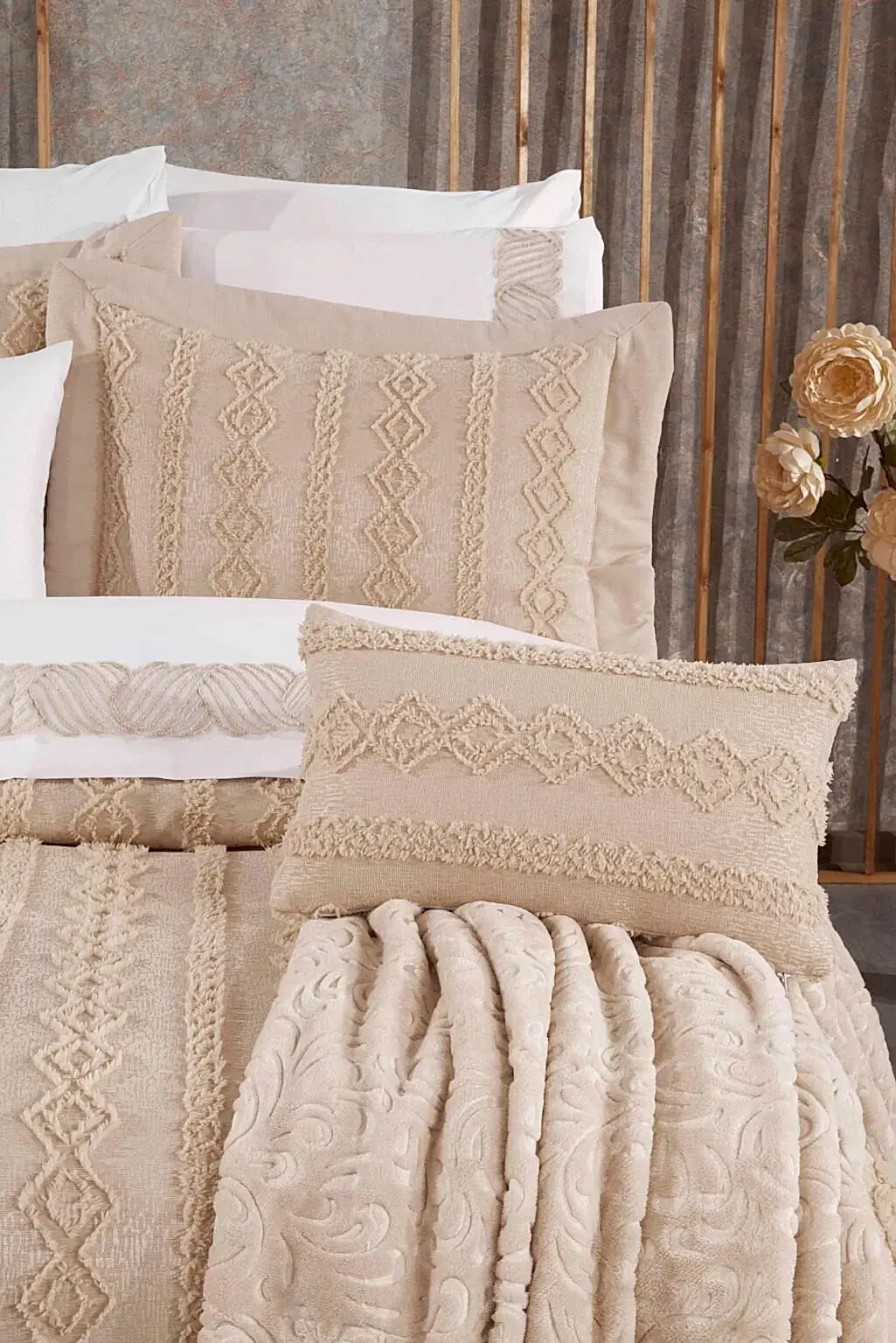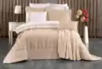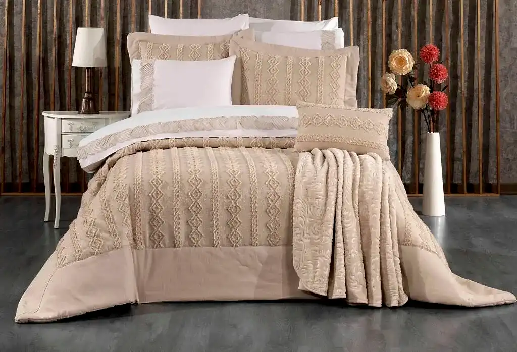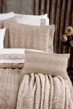 Set içerisinde yer alan yatak örtüsü, nevresim takımı ve yumuşacık battaniye, birbirleriyle tam uyumlu renk ve desenlerden oluşur. 6 adet yastık kılıfı (dantelli, desenli ve pano) ile yatağınızda katmanlı ve lüks bir otel konforu oluşturabilirsiniz.