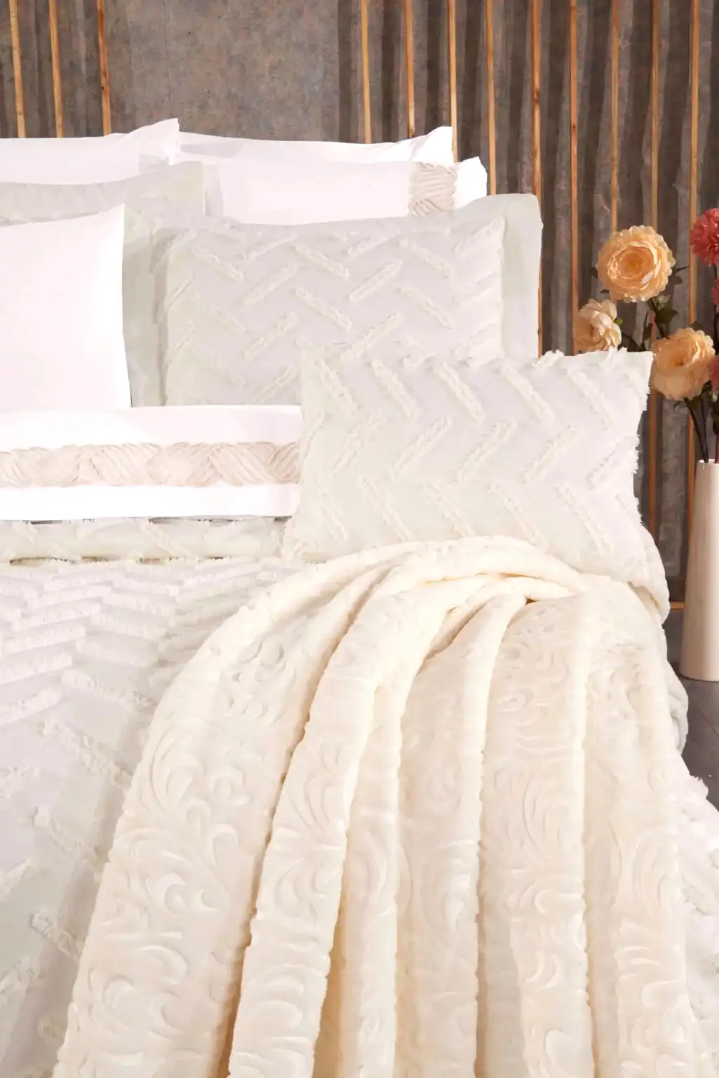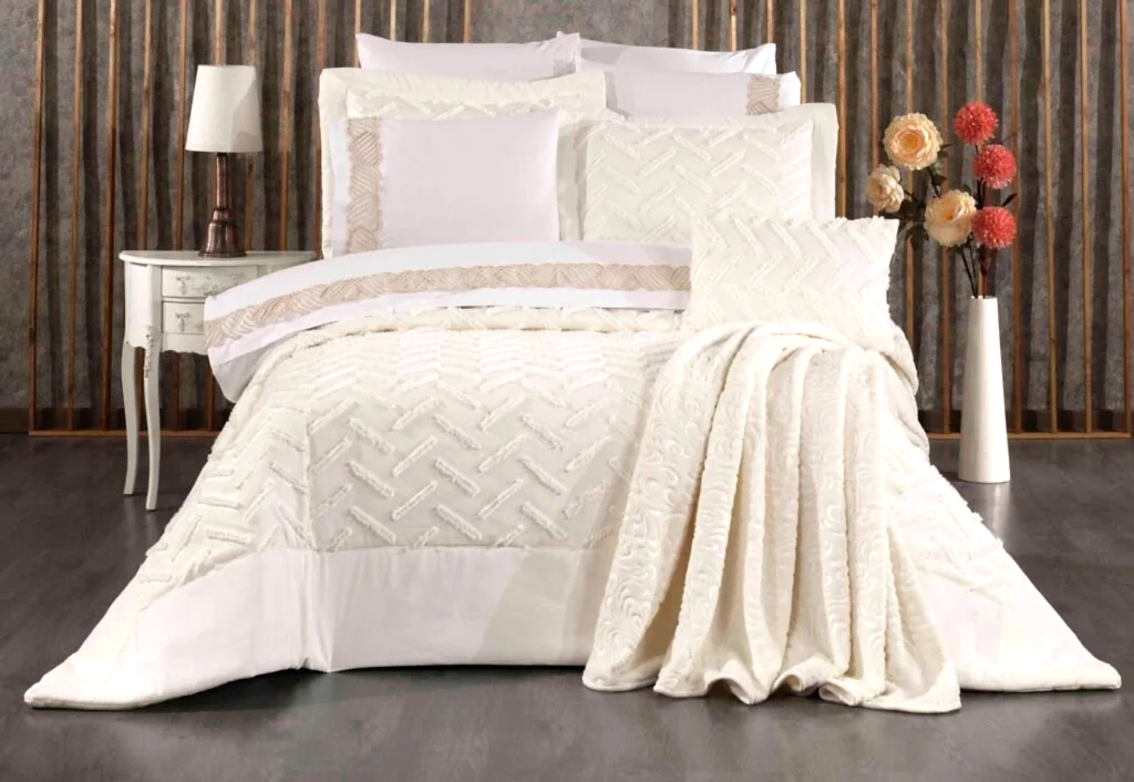 Set içerisinde yer alan yatak örtüsü, nevresim takımı ve yumuşacık battaniye, birbirleriyle tam uyumlu renk ve desenlerden oluşur. 6 adet yastık kılıfı (dantelli, desenli ve pano) ile yatağınızda katmanlı ve lüks bir otel konforu oluşturabilirsiniz.